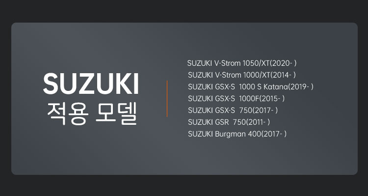 호환가능 모델 : 브이스트롬1050(2020~),브이스트롬1000(2014~),GSX-S 1000 Katana(2019~),GSX-S 1000F(2015~),GSX-S 750(2017~),GSR750(2011~),버그만400(2017~)
