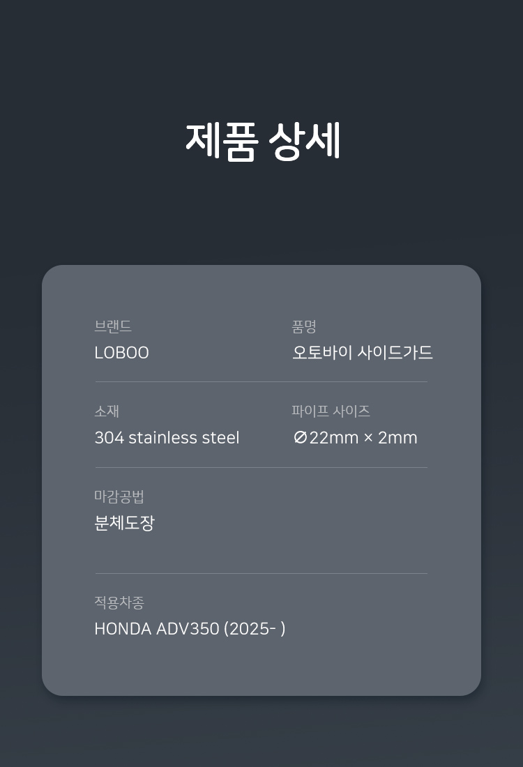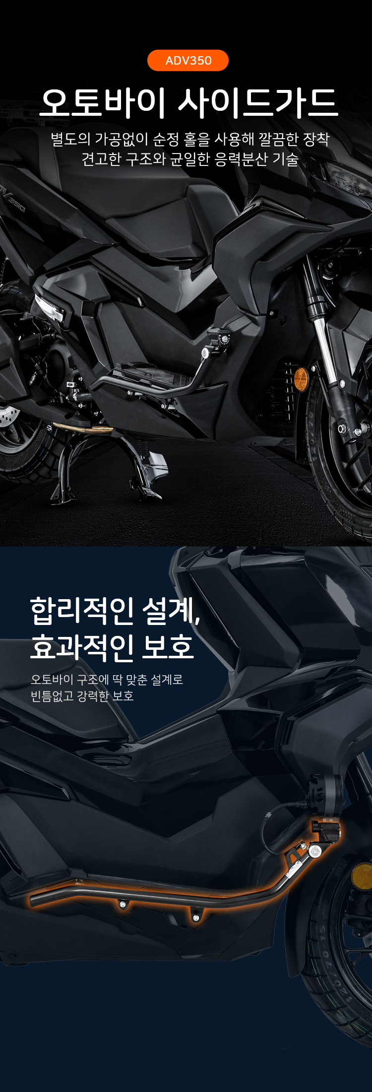 혼다 ADV350에 최적화된 로부 사이드가드. 별도 타공 없이 장착 가능하며,오토바이 순정 구조에 맞춘 안정적인 설계로 충격으로부터 차체를 효과적으로 보호합니다.