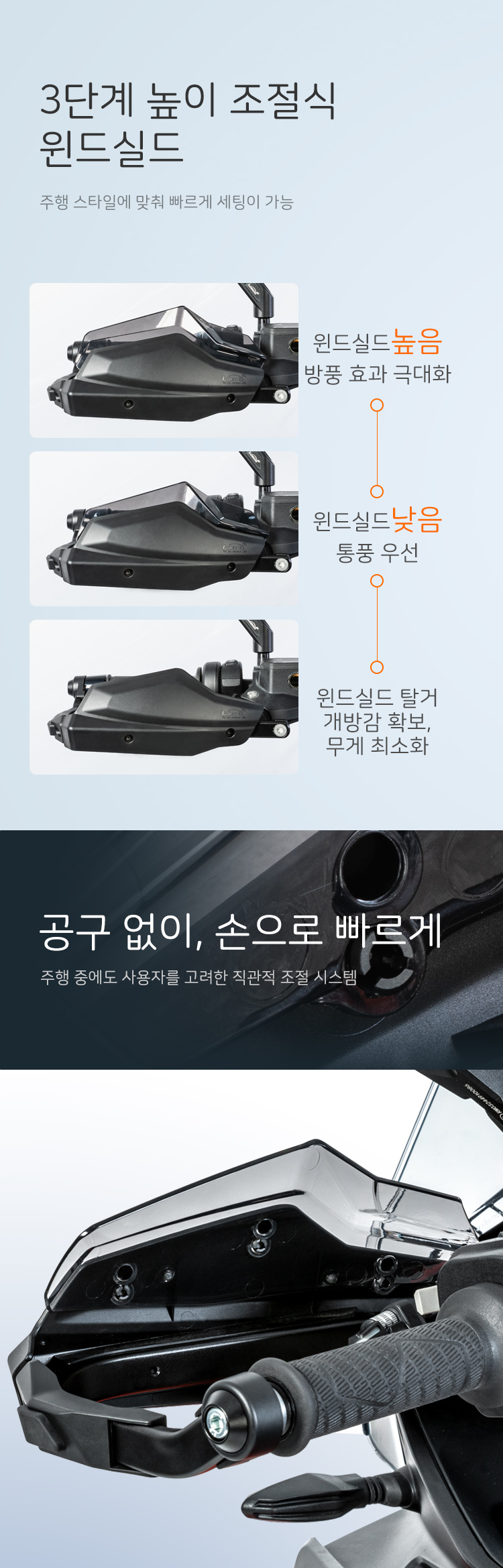 고강도 알루미늄 합금 프레임과 3단 조절식 윈드실드 설계로