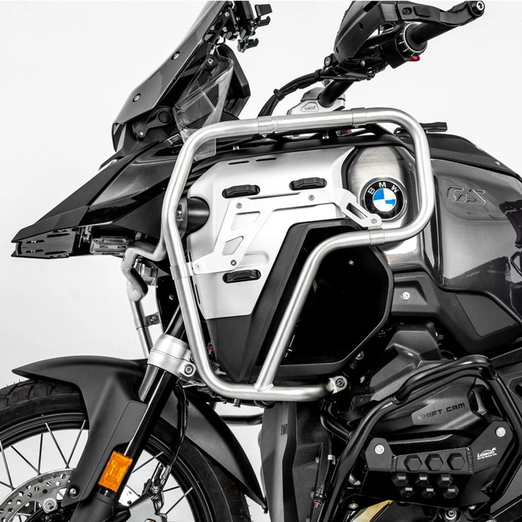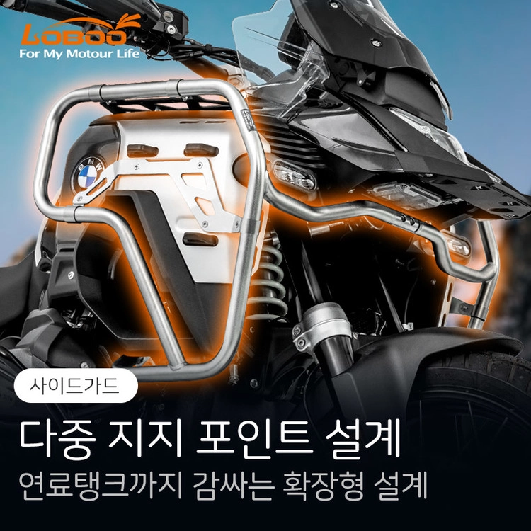 BMW R1300GS ADV 전용 사이드가드 엔진가드, 정밀 설계와 내구성을 갖춘 스테인리스 가드. 실버, 블랙 2컬러. 무가공 장착, 안개등 마운트 지원.